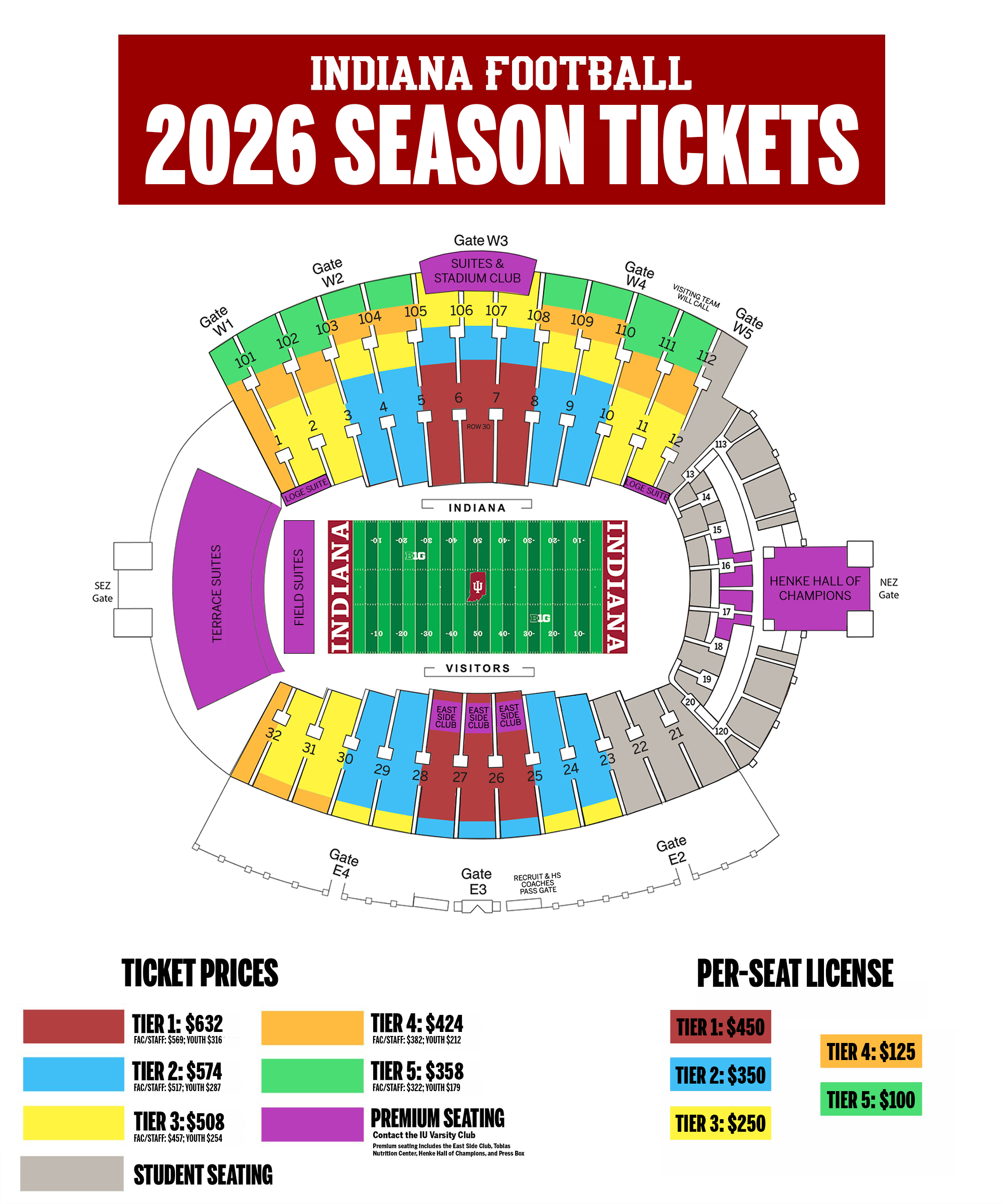 IU will not be conducting a full stadium reseat for the 2026 football season. Returning ticket holders will have the option to maintain the same seats as 2025. Any additional or new tickets will be selected based on availability and in order of Priority Points. The seat selection process gives season ticket holders the opportunity to select seating based on Priority Points accumulated through philanthropic donations, consecutive years being a Varsity Club donor, and season ticket holder loyalty. Each individual season ticket holder will be able to choose their newly purchased seats based on their cumulative Priority Point total as of March 31, 2026 in an available location that best aligns with what they are interested in (price point, location, etc.).